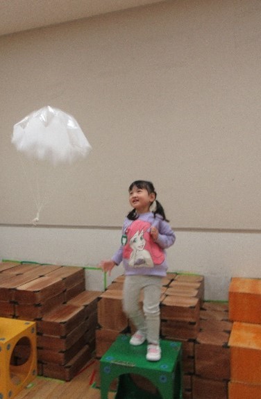 投げた人のところに戻ってくる紙飛行機やパラシュート、タンポポの綿毛など、日々の遊びの中でも取り入れることができそうなものを題材にしてくださったこともあり、公演が終わると早速子どもたちは自分たちで作って遊んでいました。