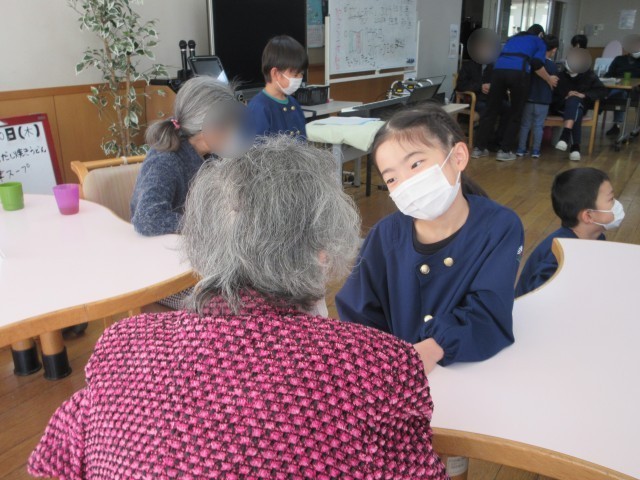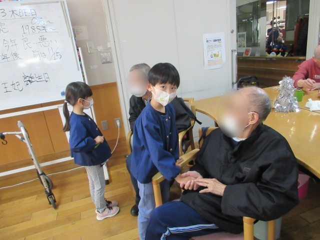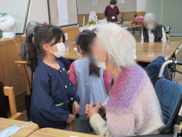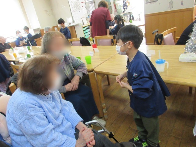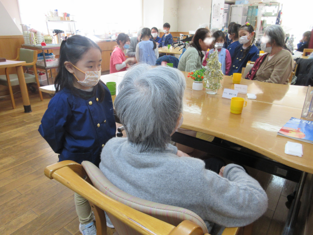 おじいさんおばあさんも知っている『大きな栗の木の下で』と『』どんぐりころころ』のうたを一緒に歌った後、おじいさんおばあさんの近くへ行ってお話をしました。