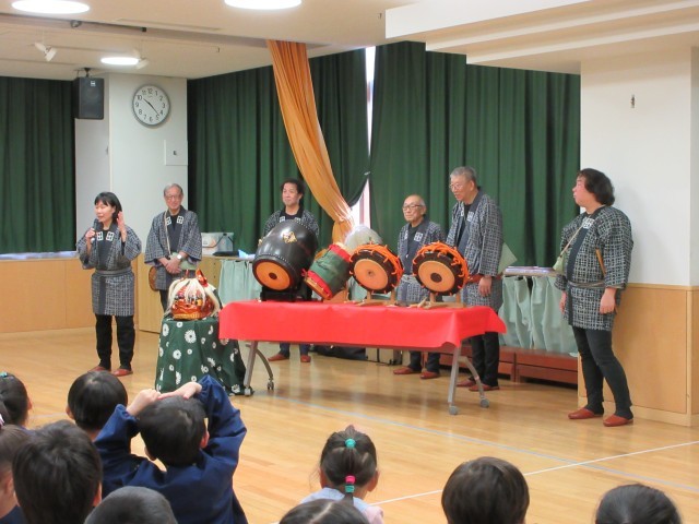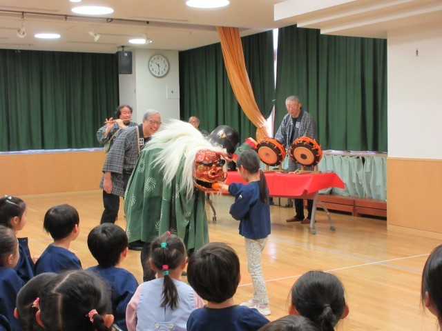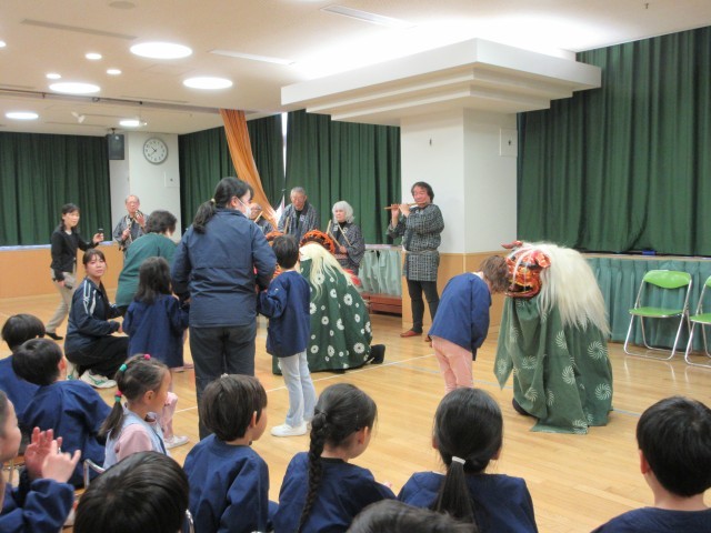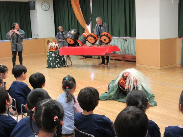 麹町囃子の方々をお迎えして、お囃子と獅子舞の鑑賞をしました。