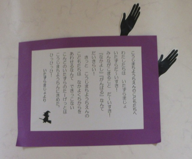 数日前に幼稚園に『なかよし』『がんばる』が大嫌いないたずら魔女から手紙が届きました。麹町幼稚園がいたずらのターゲットになってしまったようです。