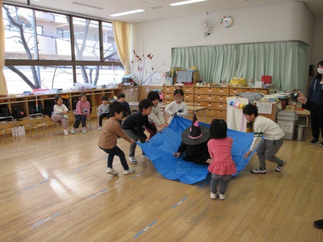 幼稚園のみんなで、違うクラスの友だちとも仲良くする、一緒に頑張れば大丈夫かも…といたずらを魔女に勝つ方法を考えました。