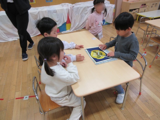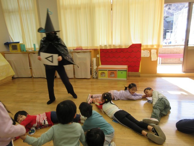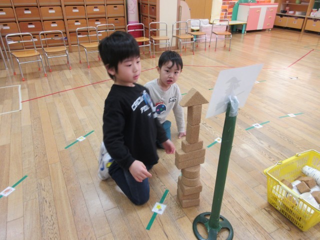 重たい魔女を力を合わせて運んだり、グループのみんなで話しあって魔女に言われた形を作ったり、魔女が壊してしまった園章を考えて直したり、工夫して積み木を積んだりしました。
