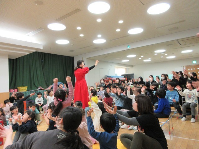 コンサートでは、『きみのなまえ』『だれだっておたんじょうび』『ヤッホ・ホーまたはめだるあげます』『ぼよよん行進曲』を聴かせていただきました。子どもたちも掛け声で参加したり、一緒に踊ったりして楽しい時間を過ごすことができました。