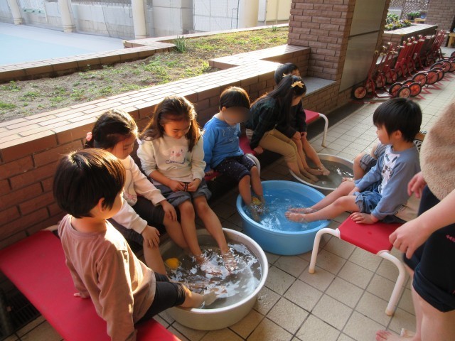 小学校の校庭で実ったナツミカンの皮をたくさん頂いたので、預かり保育の時間に『ナツミカン風呂』の足湯に入りました。