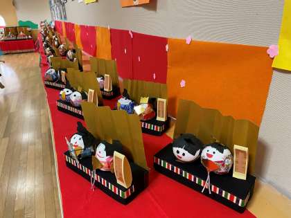 幼稚園では、のり・ボンド、和紙や布、紙粘土など各学年様々な材料を使って素敵なお雛様を作り、飾りました。