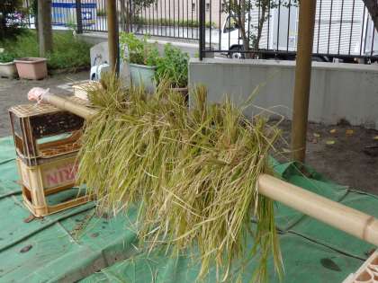刈った稲は、はざ掛けにしました。天日に干してから脱穀・もみすりをする予定です。