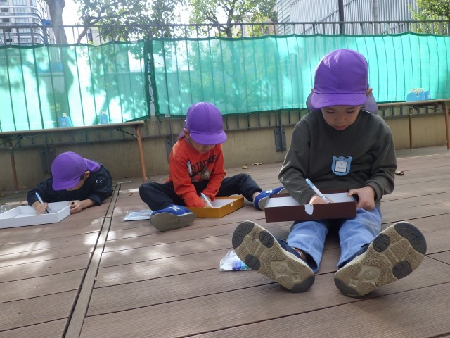 小枝やドングリ、マツボックリなどの自然物を使って、コリントゲームを作りました。箱の中に自分の好きな絵を描き、イメージの世界を楽しみながら小枝でコースを作りました。ドングリを転がした時に、ドングリの形によって不規則な動きをする面白さに気付き、繰り返し転がしたり、友達のコリントゲームも挑戦したりして楽しみました。