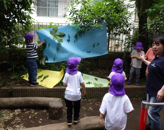 その後、気に入った葉っぱで空想の生き物作りを楽しみました。「しっぽから、くさい匂いを出す生き物だよ」「大きな葉っぱで泳げるよ」と、葉っぱの構成を楽しんだり、自分がイメージしたことを友達に伝えたりなど、イメージを膨らませ空想の世界を楽しみました。