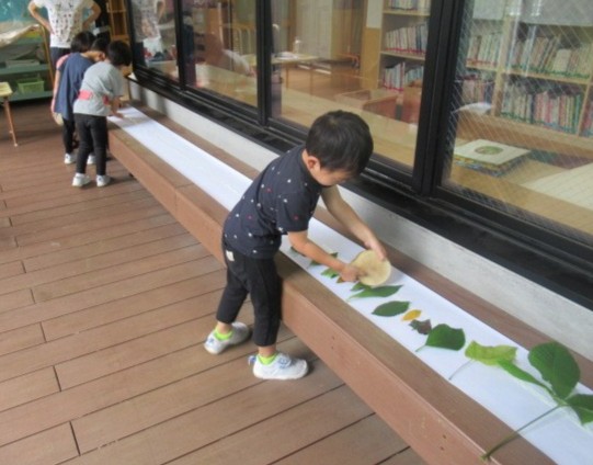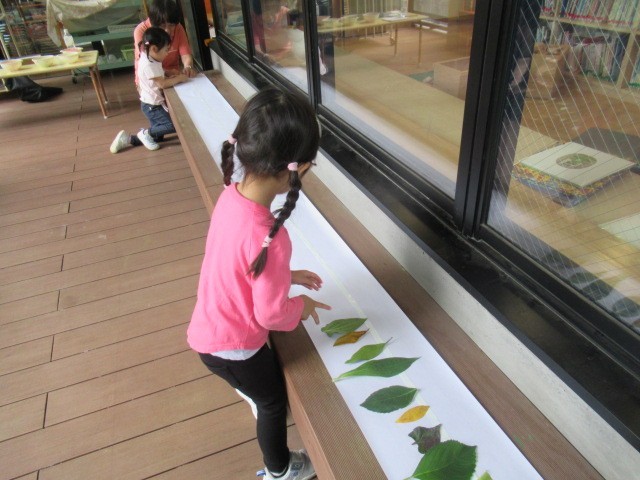 園庭にある葉っぱを取ってきて、「どっちが大きいかな?」と大きさや長さを比べながら並べたり、「あれ?同じ形の葉っぱなのに、こっちの方が濃い色してる!」とわずかな色の違いに気付き、グラデーションになるように並べたりして遊びました。