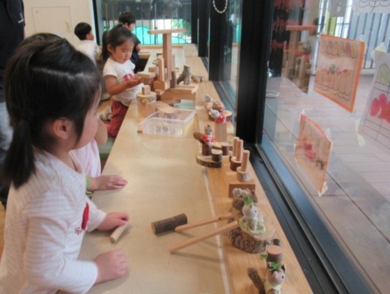 また、ウレシパモシリの方から頂いた木片を組み合わせて人形の家作りを楽しみました。一つ一つが自然な形をしているため、「こっちを下にすると丈夫になった!」など、崩れないようにバランスを考えながら組み合わせ、窓際に並べました。まるで人形たちが森の中から外の世界をのぞいているような雰囲気になり、ウットリした表情を見せる子どもたちでした。