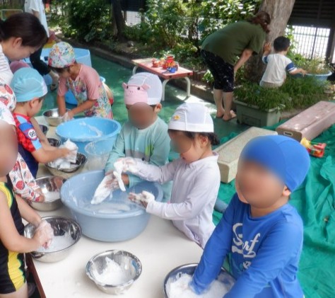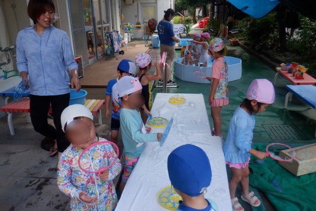 泡遊び、色水遊び、寒天遊び、氷遊び、シャボン玉など、感触や冷たさを感じながらどの学年でも楽しめる遊びを、毎日趣向を変え提示しています。
