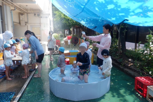 暑い日も多く、なかなか外遊びができる日も少ない中で、少しでも涼を感じながら楽しめる遊びを工夫しています。預かり保育の職員を中心に、今年は夏休み前から教材研究と作戦会議を何度も繰り返して迎えた夏季預かり保育です。