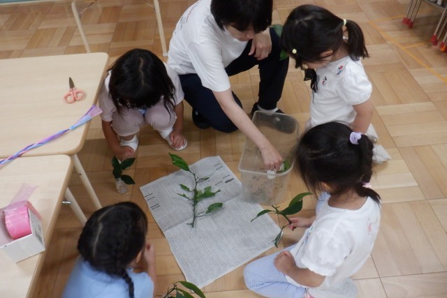 食いしん坊のアゲハの幼虫のために、園庭の夏みかんの葉をとってあげたり、カメやカブトムシに餌をやったりしています。