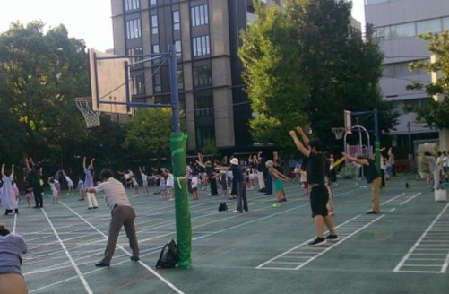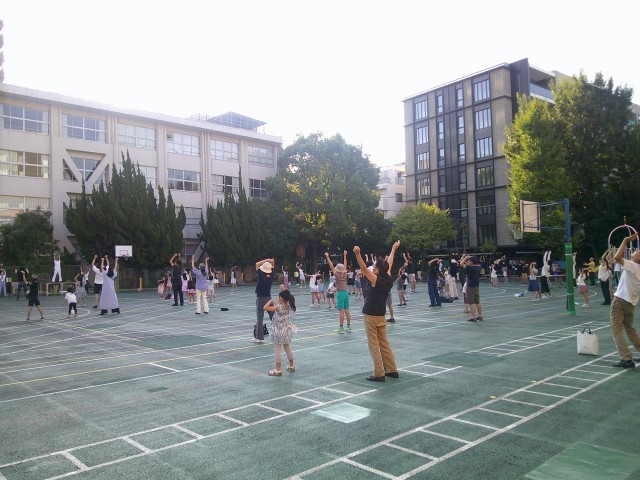 本日で4日目。毎日100名以上の方が参加し、みんなで校庭いっぱいに広がり青空のもと体操しています。