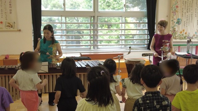 誕生会の″おたのしみ”で、「東雲打楽器二重奏」の方に来ていただき、すてきな打楽器の演奏を聴かせていただきました♪