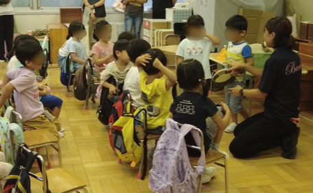 2枚目は4歳児さくら組です。さくら組では、タンバリンやカスタネットを使い、言葉とともにいろいろなリズムを鳴らしてみる遊びをしていました。また、楽器のリズムだけで好きな動物の名前を表し、クラスの友達がその動物をあてるというクイズも楽しんでいました。