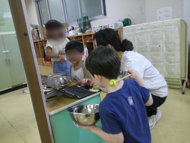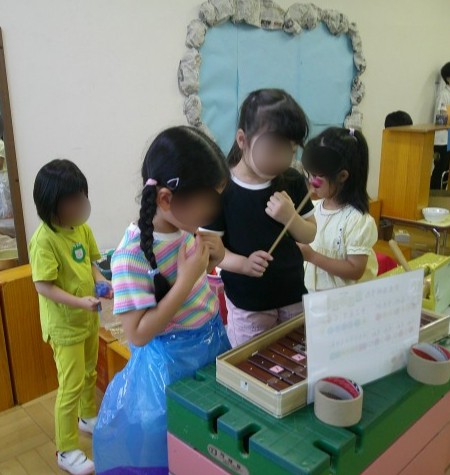 3枚目・4枚目は5歳児うめ組です。昨日見たマリンバの小型版ともいえる木琴が環境として出されていました。早速興味を持った子がいろいろな音を奏ででいました。そのうち、大好きな電車の発車メロディーを木琴で奏でたいということになり、教師と一緒に動画で発車メロディーを調べ、楽譜起こしをし、発車メロディーを完成させていました。また、色とひらがなで教師が作った楽譜をもとに、知っている曲を友達と演奏する姿もありました。
