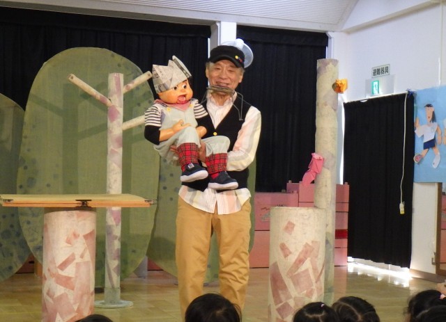 今年は、幼稚園の遊戯室で観劇したため、すぐ目の前で展開されるお話に、全学年の子どもたちが釘付けでした。