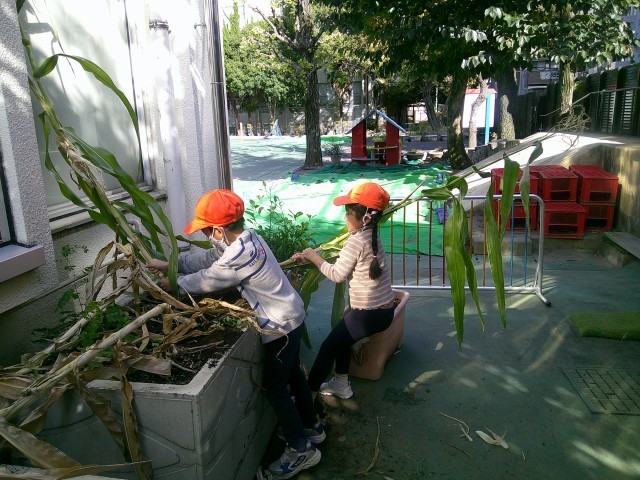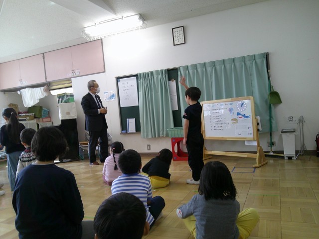 5歳児うめ組は、ちょうどその時期、園庭で大切に育てていたポップコーンが収穫間際にかじられ、茎が折れている事件があり、「きっと動物の仕業だ!何の動物か石井先生に聞いてみよう」ということになりました。状況や動物の特性などからみんなで推理し、探究した子どもたち。「せっかく育てたのにひどい!」憤っていた子どもたちですが、石井先生の「でも、どうしてそうなってしまうのか考えてみよう」の言葉で、動物も食べていかないと生きていけないことや、山や森が減って動物の餌や住む場所が減ってきていることなどにも話題が及び、複雑な表情に。子どもたちなりに、自然の摂理や難しさ、いろいろな角度から見てみると、ということにふれる機会となりました。