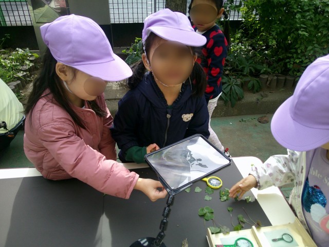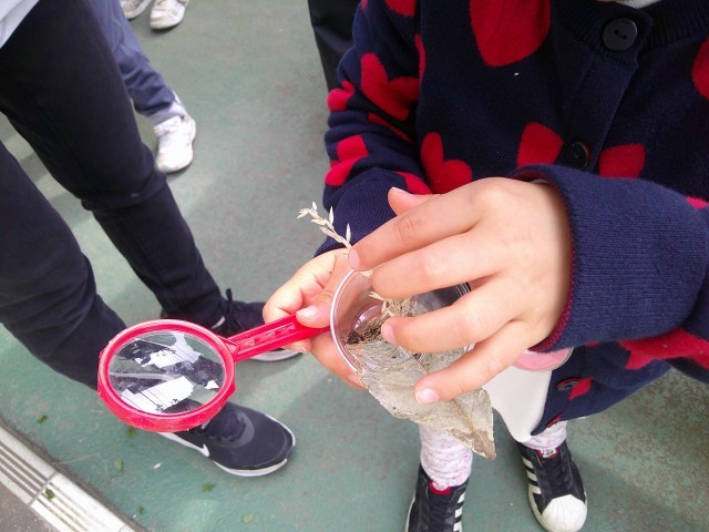 3歳児もも組、4歳児さくら組は、石井先生と一緒に前庭でいろいろな自然物を探索。「見て見て」「これは何?」と発見の喜びや不思議を石井先生に伝えたり、図鑑と見比べたり、・虫眼鏡を使ってよく見たりして、自分なりの探究を楽しむ子どもたちでした。