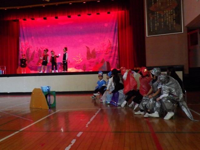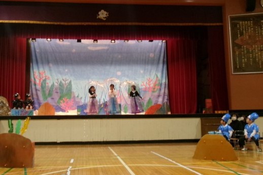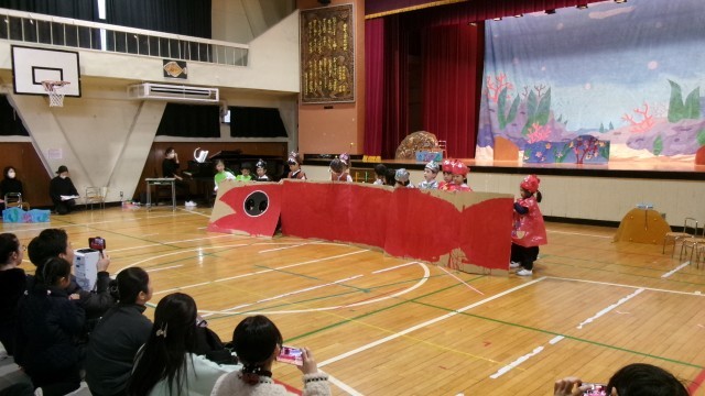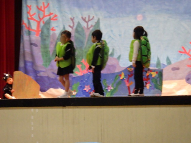 5歳児うめ組は、劇「スイミーとうみのさかなたち」をしました。おなじみの絵本をもとに、うめ組の子どもたちと先生たちとで作り上げたオリジナルのストーリーです。「こんな生き物が出ていたら楽しそう」「見ている人が楽しい気持ちになるように最後はなかよしになるお話にしたい」など、みんなで話し合いを重ねながらストーリーを作りました。