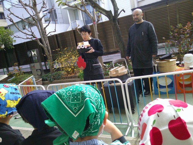 明るい穏やかな日差しのもと、釜浅商店の方がせっせとお米をしかけてくださったり、前庭の釜から湯気があがってきたりする様子を、興味津々に見守る子どもたち。さて、お米はどうなったでしょうか?