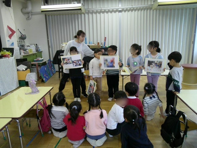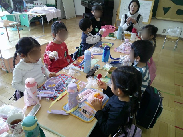 いただきますの前には、うめ組が、土づくりから収穫までを紙芝居形式の写真で、さくら組・もも組に教えてくれました。昨年は、こうした姿を見て期待や憧れを抱いていた子どもたちが、今度は次の学年に伝え引き継ぐ番です。こうして、脈々と、子どもたちから子どもたちに、番町幼稚園の文化が引き継がれていきます。