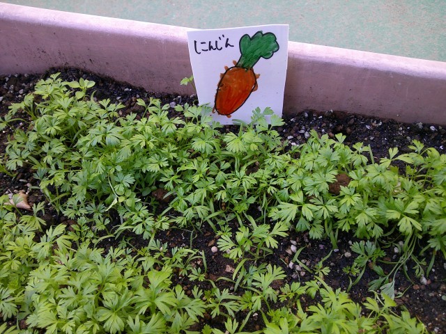 また、4歳児さくら組のダイコン・タマネギ、3歳児もも組のニンジン・ブロッコリー・カリフラワー・イチゴも、寒さに負けずたくましく生長しています。