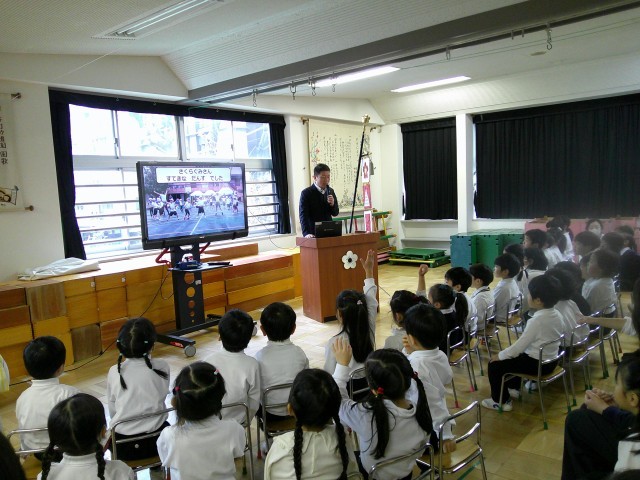 終業式の後は、4歳児さくら組から5歳児うめ組に、「お米パーティー」のお礼や2学期様々な行事をリードしてくれたお礼を伝える場面がありました。また、どの学年も、年末・学期末に向けて、保育室やロッカーなどを大掃除したり、たくさん遊んだ遊具をきれいにしたりして、終業式を迎えました。