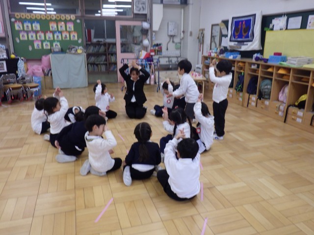 3歳児もも組では、帰る前に2学期に楽しんだ遊びをみんなで楽しんでいました。2学期の園生活が楽しかったという満足感と、次に幼稚園に来ることが楽しみという期待感をもてるようにと、ねらいに基づいた活動です。