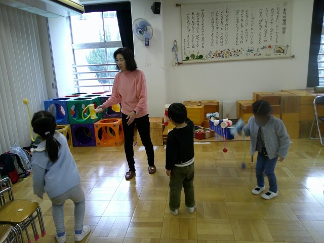 独楽回し・けん玉・羽根つき・すごろく・お手玉・おはじきなど、昔遊び・伝承遊びを一緒にしていただきました。