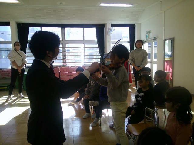最後は、全員が子ども用のバイオリンを弾かせていただく機会もあり、何度もリピートして弾かせててもらう子もいるほど充実のひと時でした。