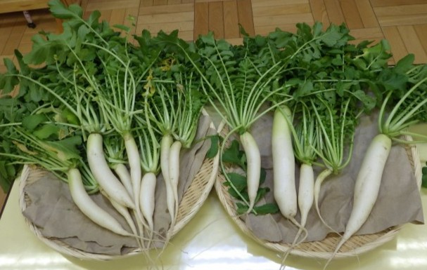 4歳児さくら組は、9月から大事に大事に育てていたダイコンの収穫をしました。「うんとこしょ どっこいしょ!」立派なダイコンは抜くのに力もいります。採れた喜びも格別です。こんなに採れましたが、まだ、次の美味しいお料理を土の中で待っているダイコンもあるほど今年は大豊作!でした。