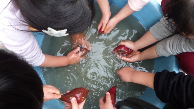 3歳児もも組は、秋に園庭で掘って「おいしくなあれ」と熟成させていたお芋を、みんなでゴシゴシ洗いました。