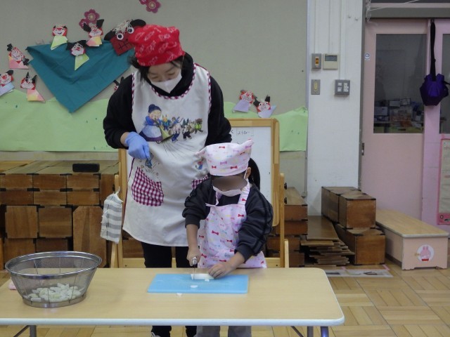 4歳児さくら組は、包丁を使って自分たちで収穫したダイコンを切りました。カレーパーティに続き2度目の包丁の体験。カレーパーティーをきっかけに、お家でも包丁を使ってお家の人とお料理をするようになったという子もいて、頼もしくなったお料理姿です。