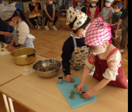 3歳児もも組は、型抜き器を使って、こんにゃくを型抜きしました。「つめた~い」「ぷるんぷるんで気持ちいいね」・・・無理なく安心して調理の経験をみんなでしながら、さくら組での包丁を使った調理に一歩ずつ近づきます。