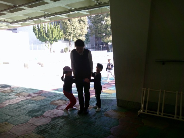 この日は、園長先生も一緒に、「こちょこちょ鬼」と「電子レンジ鬼」を楽しんでいました。「電子レンジ鬼」は、捕まった仲間を、二人で力合わせて助ける助け鬼の要素も含んでいます。