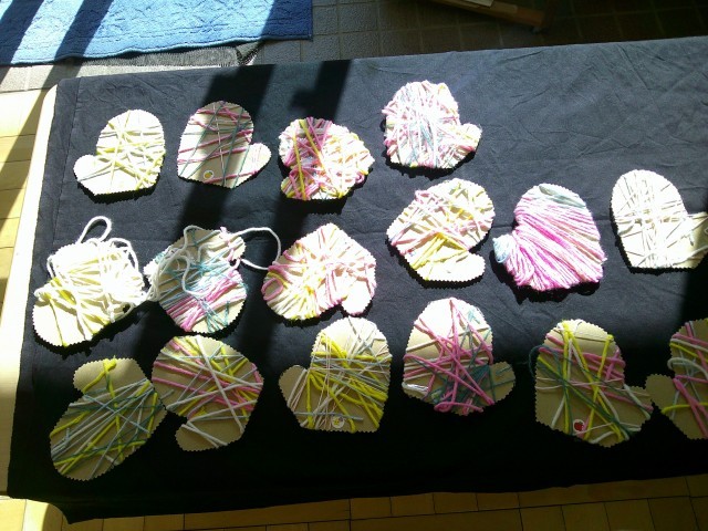 保護者の方や地域の方に見守られながら、一生懸命説明を聞き、「どんな色にしようかな?」と毛糸を選んだり、厚紙に毛糸を巻き付けたりして、ぽかぽかのてぶくろ🧤ができあがりました。