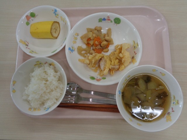 9月29日(月)献立名:ごはん・とり天・れんこんと大豆のきんぴら・みそ汁・くだもの(バナナ)・牛乳