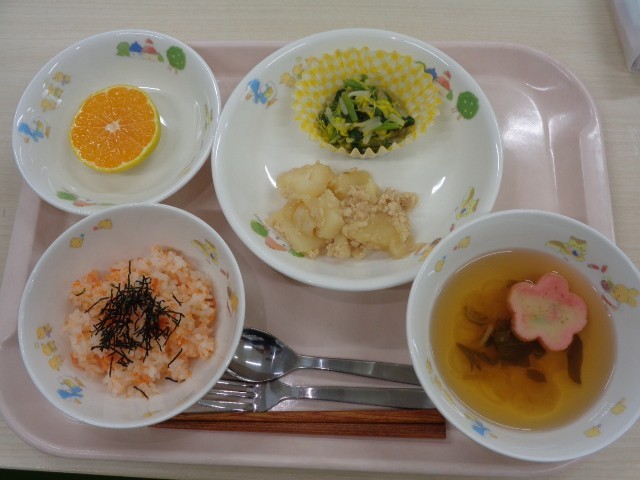 10月7日(火)の給食 公開日 2025/10/07 更新日 2025/10/07 今日の給食 10月7日(火)【お月見献立】 献立名:鮭ごはん・じゃが芋のそぼろ煮・ほうれん草と菊のサラダ・すまし汁・くだもの(みかん)・牛乳