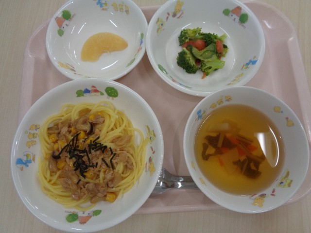 10月9日(木)献立名:きのこの和風スパゲッティ・ブロッコリーとトマトのサラダ・かぶのスープ・
