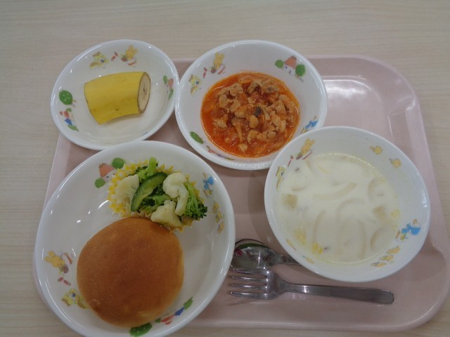 10月14日(火)の給食 公開日 2025/10/14 更新日 2025/10/14 今日の給食 10月14日(火)献立名:パインパン・鶏肉のトマト煮・ブロッコリーとカリフラワーのサラダ・ベーコンとコーンのクリームスープ・くだもの(バナナ)・麦茶