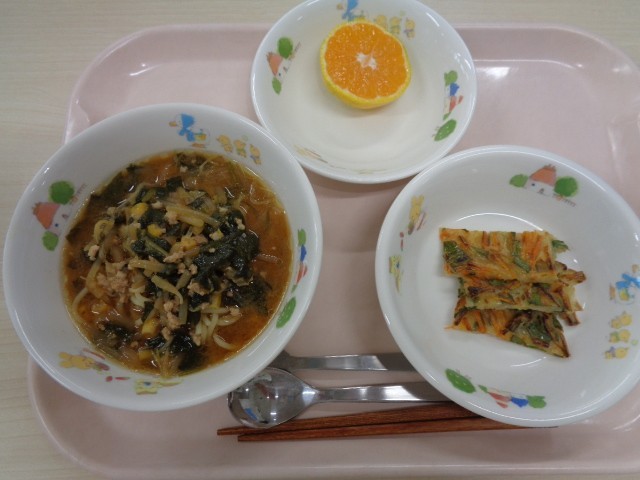 10月15日(水)献立名:コーンもやし味噌ラーメン・米粉のチヂミ・くだもの(みかん)・牛乳