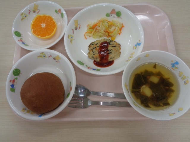 10月21日(火)の給食 公開日 2025/10/21 更新日 2025/10/21 今日の給食 10月21日(火)献立名:ココアパン・豆腐とひじきのハンバーグ・コーンのサラダ・野菜スープ・くだもの(みかん)・牛乳