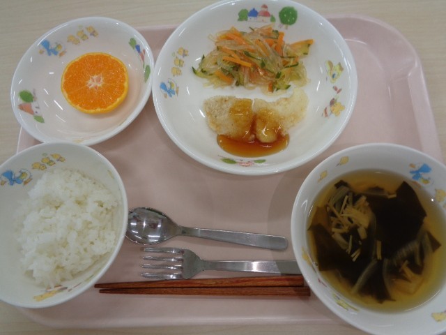 10月31日(金)献立名:ごはん・白身魚の甘辛あん・春雨サラダ・わかめスープ・くだもの(みかん)・牛乳