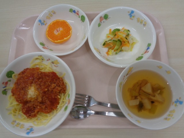 11月12日(水)の給食 公開日 2025/11/12 更新日 2025/11/12 今日の給食 11月12日(水)献立名:スパゲティーミートソース・白菜とにんじんのサラダ・かぶのスープ・くだもの(みかん)・牛乳