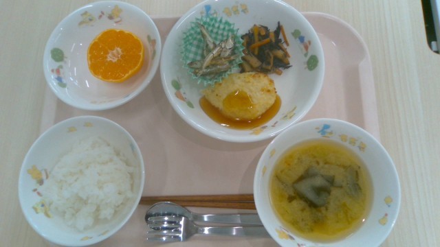 11月21日(金)の給食 公開日 2025/11/21 更新日 2025/11/21 今日の給食 11月21日(金)献立名:ごはん・豆腐のつくね焼き・ひじきとさつま揚げの炒り煮・みそ汁・炒り煮干し・くだもの(みかん)・牛乳