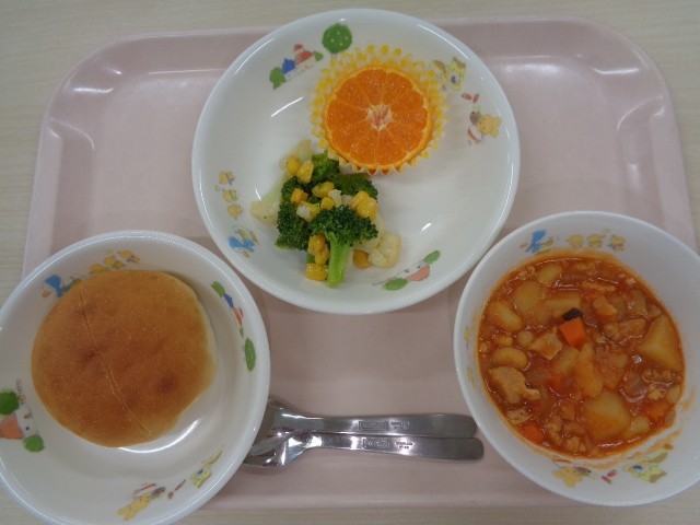 12月4日(木)の給食 公開日 2025/12/04 更新日 2025/12/04 今日の給食 12月4日(木)献立名:ミルクパン・ポークビーンズ・ブロッコリーとカリフラワーのサラダ・くだもの(みかん)・牛乳