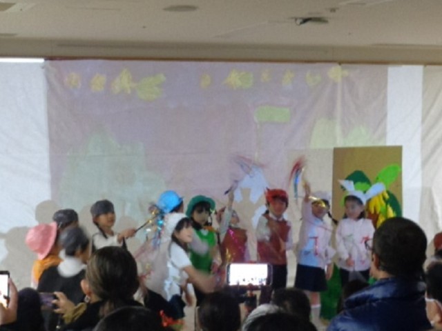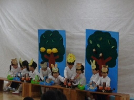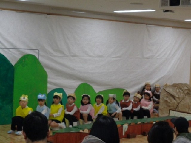 3歳児ちゅうりっぷ組は動物同士のやりとりが楽しい『どうぞ どうぞ』の表現遊び、4歳児ばら組は橋を渡ったりお風呂で背中を洗ったりする表現が楽しい『ごしごし しゅっしゅ』の劇遊び、5歳児ひまわり組は子どもたちの考えと思いが詰まったオリジナルストーリー『いろいろたんけんたい ぼうけんにいく』の劇を楽しみました。4歳児ばら組と5歳児ひまわり組は息を合わせて歌と合奏もしました。各学級が幼稚園で楽しんでいることやこれまでの生活が詰まったこども劇場となりました。
