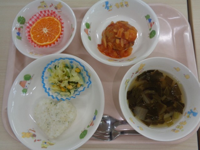 12月17日(水)の給食 公開日 2025/12/17 更新日 2025/12/17 今日の給食 12月17日(水)献立名:ガーリックライス・トマトソースハンバーグ・キャベツとコーンのサラダ・小松菜とベーコンのスープ・くだもの(みかん)・牛乳